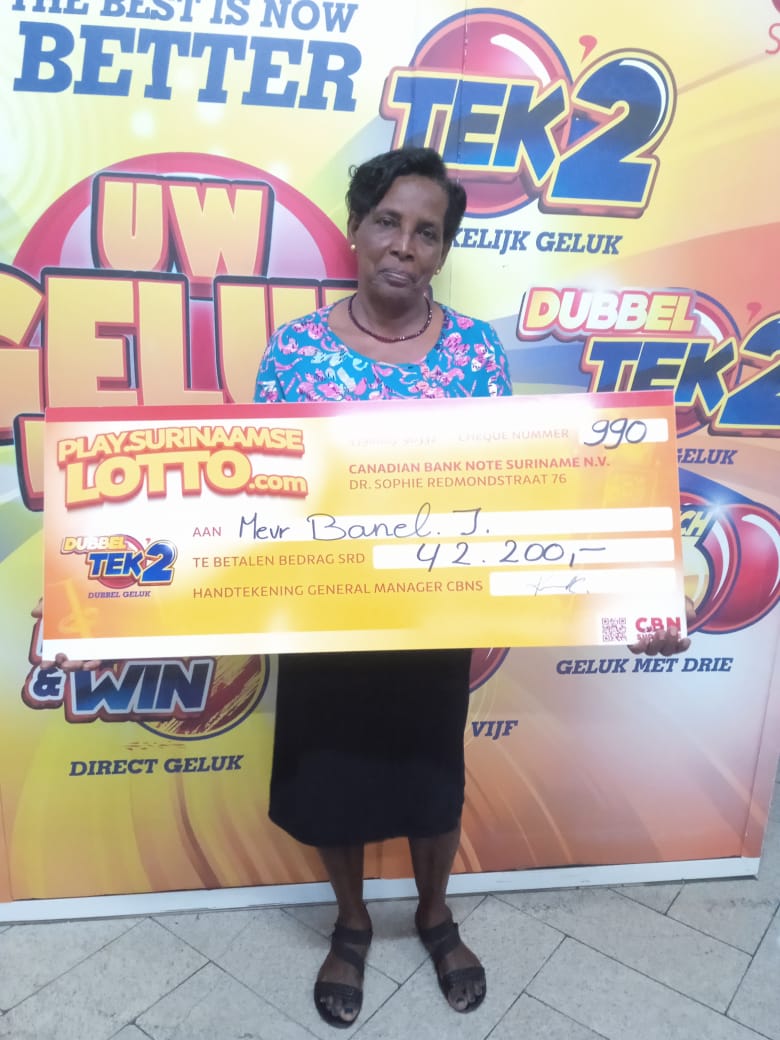 Mevr Banel I is de gelukkige Dubbel Tek'2 hoofdprijswinnares van de trekking van Dinsdag 12 Augustus 2025. Zij kocht het winnende lot bij Chin Sie Fat Shop gevestigd aan de Waterkant # 98.