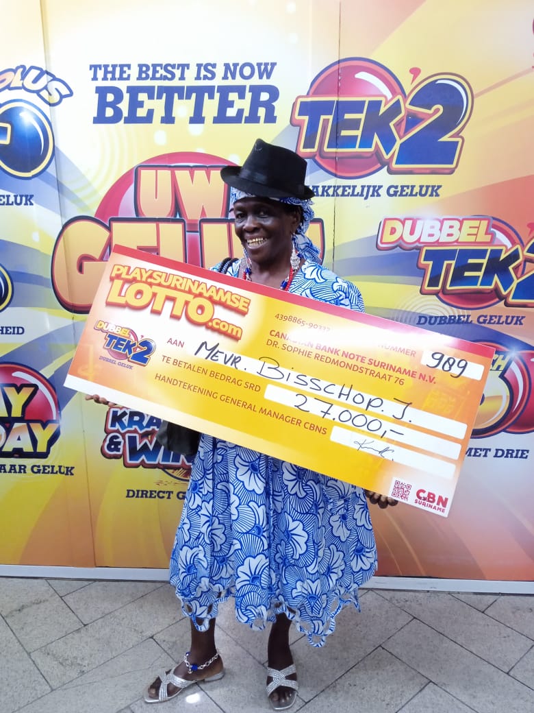 Mevr Vermeer Willietje is de gelukkige Dubbel Tek'2 hoofdprijswinnaar van de trekking van dinsdag 26 november 2024. Zij kocht het winnende lot op het hoofdkantoor van Canadian Banknote Suriname gevestigd aan DR.Sophie Redmondstaat #76.