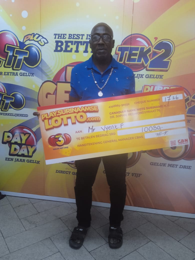 Meneer Frits Vyent is de Match 3 hoofdprijswinnaar van de trekking van 3 Oktober 2025. Hij kocht het winnende lot bij Lotterij Office gevestigd aan de Dhr. Sophie Redmondstraat 76.